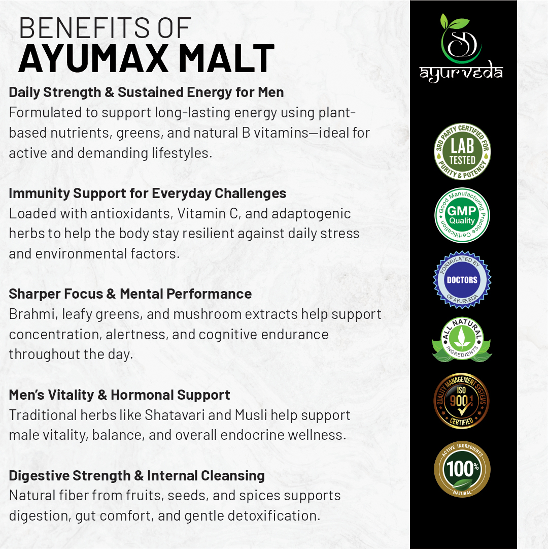 Ayurmax Malt by SD Ayurveda is a carefully crafted Ayurvedic herbal malt designed to nourish the body, boost energy levels, and enhance overall strength and vitality. Inspired by traditional Ayurvedic formulations, this malt combines time-tested herbal ingredients with nutritive elements to support a healthy and active lifestyle.