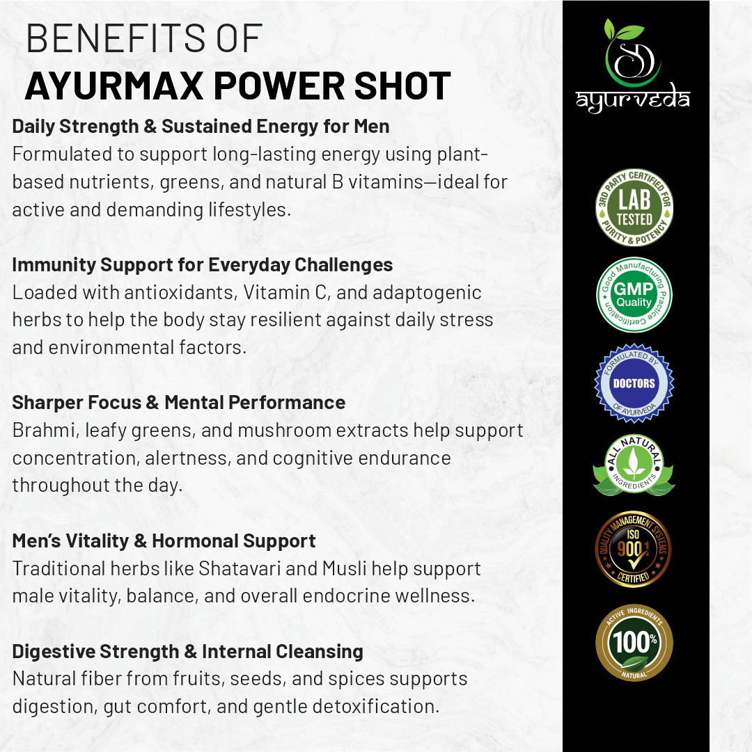 Ideal for men with active, demanding lifestyles, Ayurmax Single Use Shot is perfect for gym-goers, professionals, and those seeking natural support for performance and vitality. The ready-to-use format ensures convenience and faster absorption compared to regular supplements.