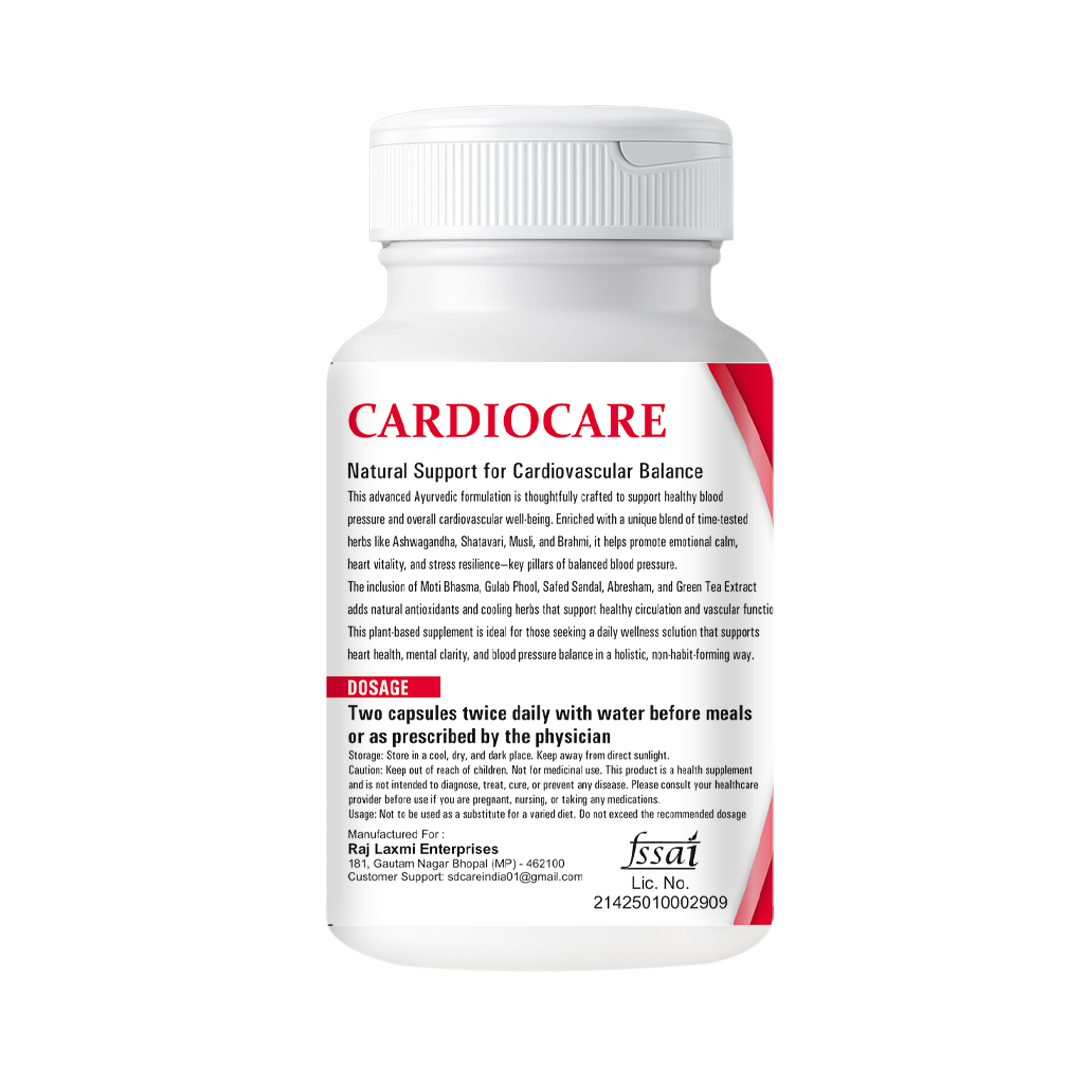 Cardio Care by SD Ayurveda is a scientifically inspired Ayurvedic blend designed to support a healthy heart and balanced circulation. Rooted in traditional Ayurvedic wisdom, this herbal formulation helps maintain cardiovascular function, improve blood flow, and support overall cardiac strength.