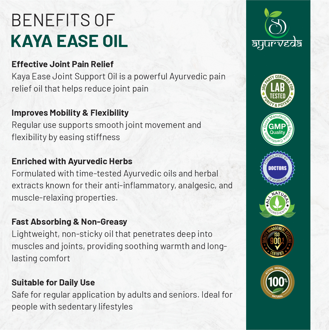 Regular massage with Kaya Ease Oil helps reduce joint pain, swelling, stiffness, and discomfort caused by arthritis, physical strain, or aging. It improves blood circulation to the affected area, promotes faster recovery, and enhances flexibility and movement.